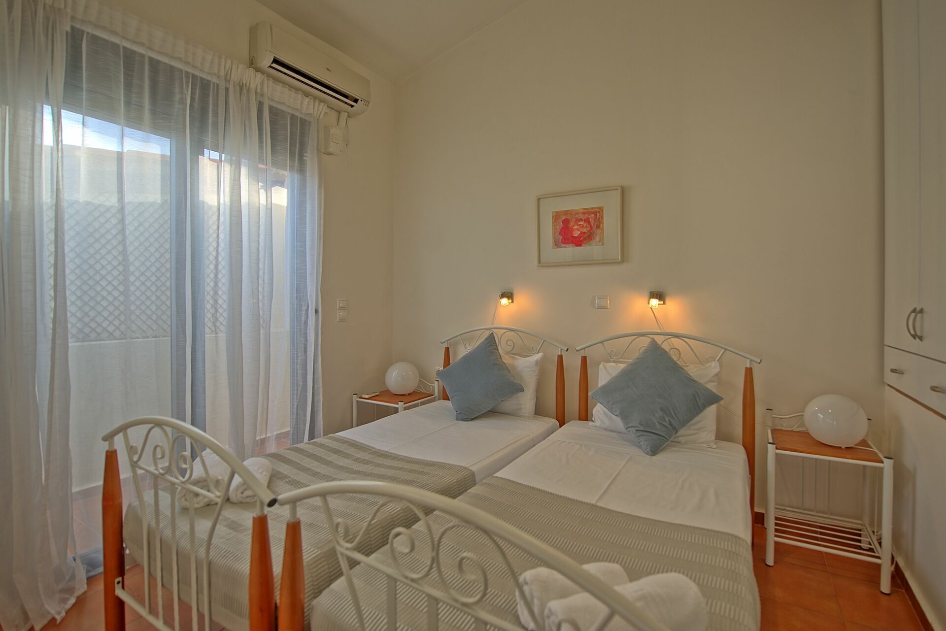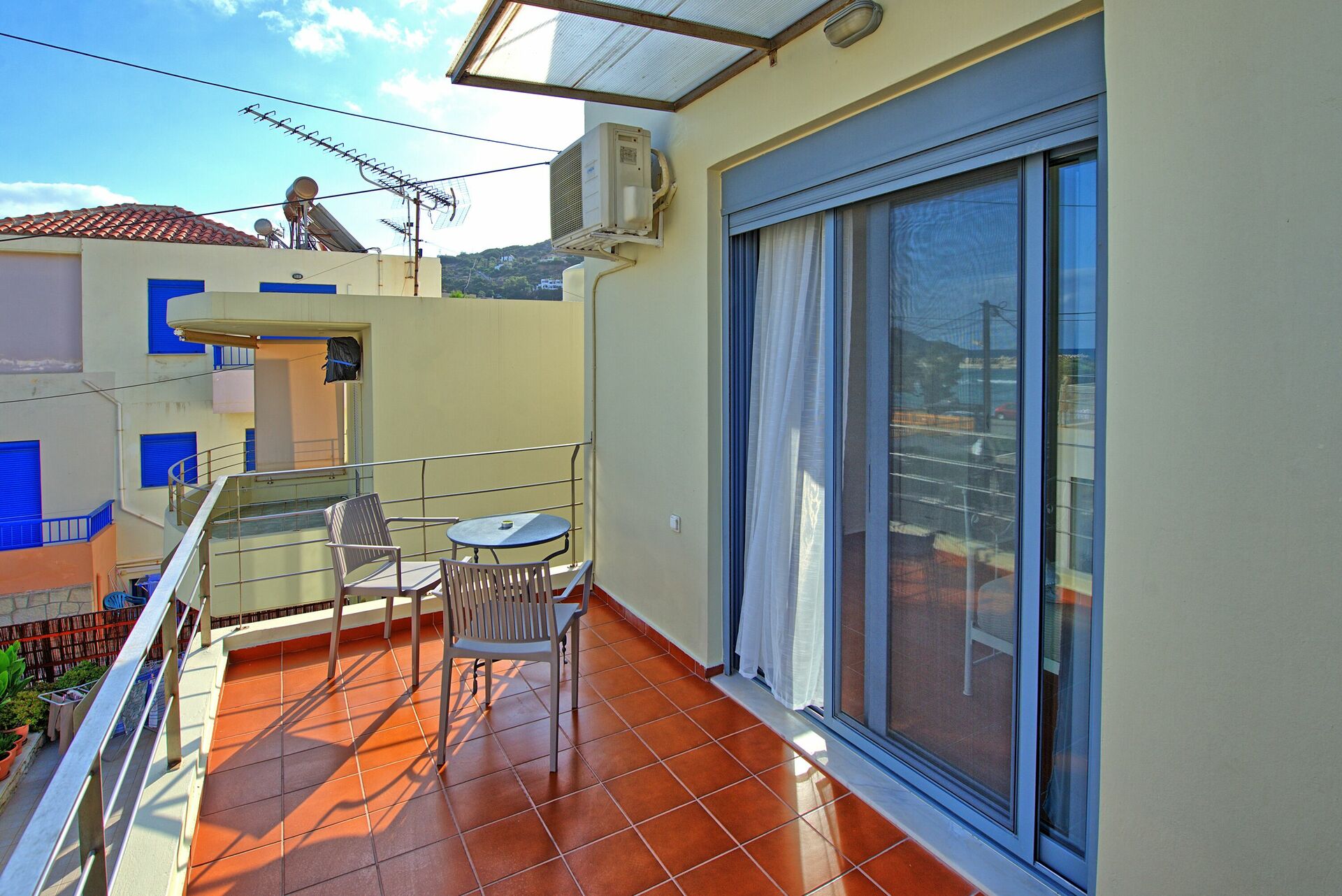 Doppelzimmer (Klimaanlage) mit eigener Terrasse, Badezimmer mit Badewanne und Waschmaschine, Zweibettzimmer (Klimaanlage) mit eigenem Balkon, Zugang zu einer kleinen Terrasse mit 2 Sonnenliegen .