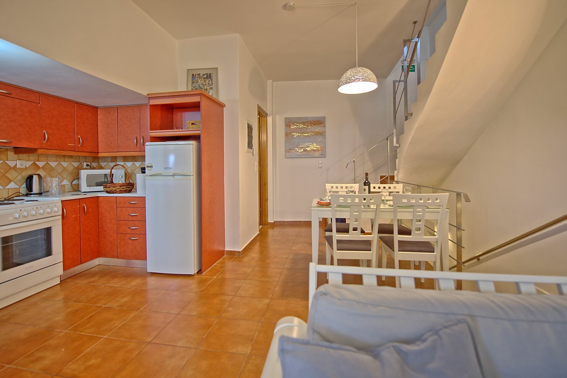 (6 Stufen): Wohnzimmer (Klimaanlage) mit Kamin und Sat-TV und Zugang zu einer privaten Terrasse mit Tisch, Stühlen und Grill für Mahlzeiten im Freien, Essbereich und Küchenzeile (Ofen, Gefrierschrank, Mikrowelle, Geschirrspüler), Bad mit Dusche.